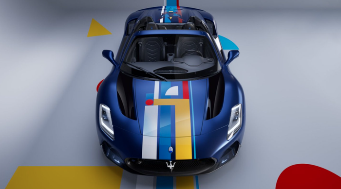 特别版MC20 Cielo设计灵感来自包豪斯艺术运动,贯穿式线条自车头延伸至车尾,呼应包豪斯学派推崇的抽象形态。车身采用磨砂赛道蓝涂装,引擎盖上由点、线、三角与矩形构成的极简三叉戟LOGO,诠释“少即是多”的核心设计构想。