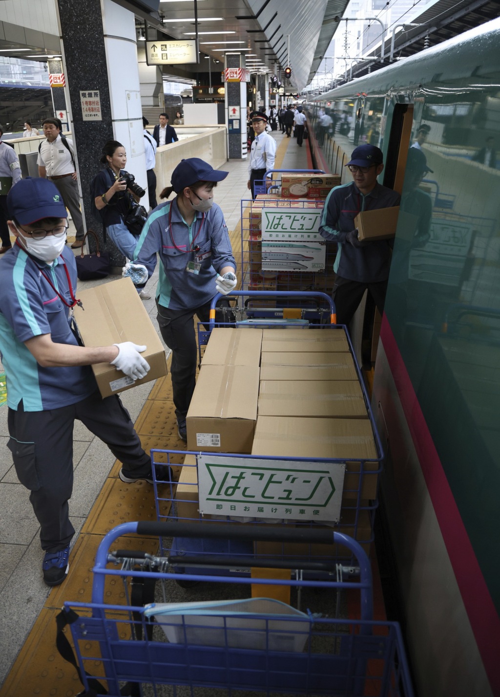 当地时间2025年6月10日,日本东京,政府储备大米通过东北新干线从仙台市运抵东京站。