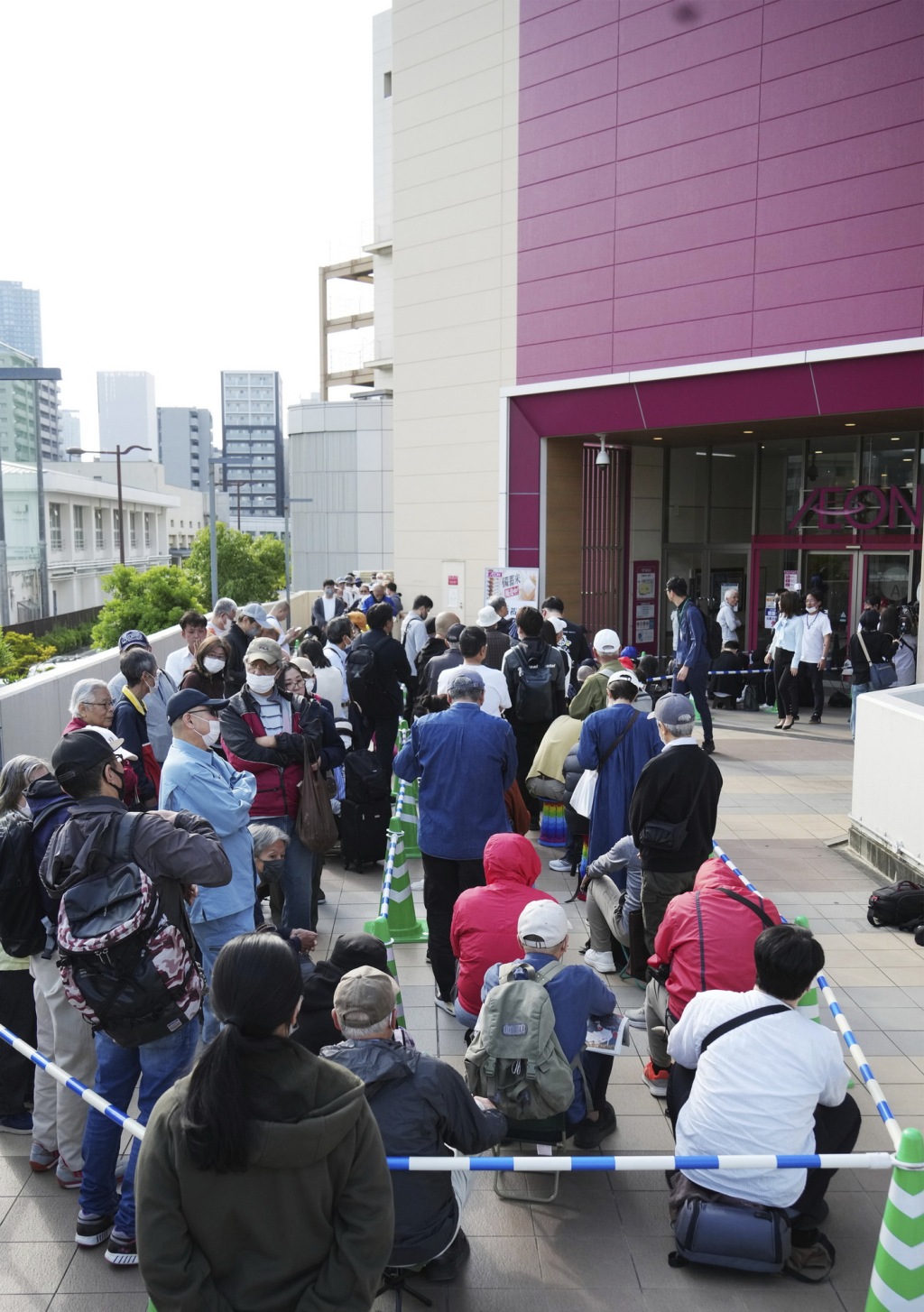 当地时间2025年6月2日,日本爱知县名古屋市热田区,人们排队等候AEON商店开门,购买大米。