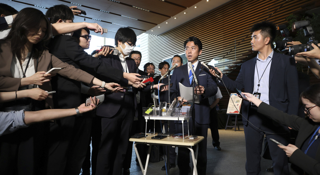 当地时间2025年6月5日,日本东京,在首相官邸,日本农业大臣小泉进次郎在稳定大米供应内阁委员会首次会议后接受记者提问。