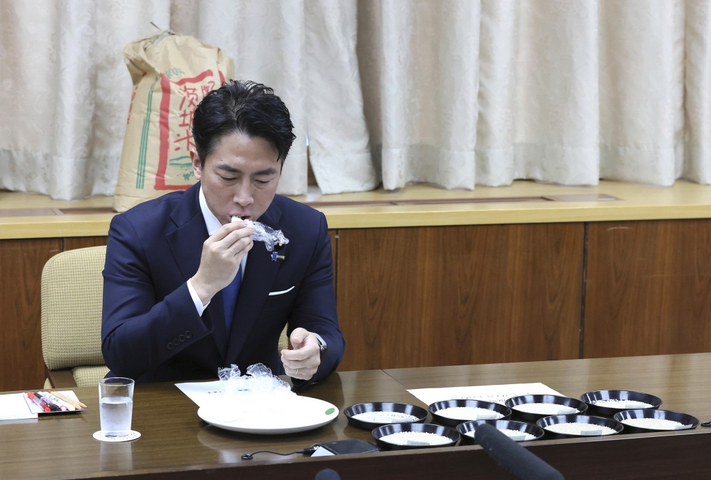 当地时间2025年5月29日,日本东京千代田区,日本农林水产大臣小泉进次郎品尝政府储备的大米。