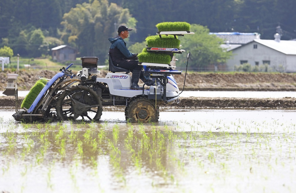当地时间2025年5月12日,日本石川县,农民在田间播种水稻。该地区于2024年1月1日遭受大规模地震。