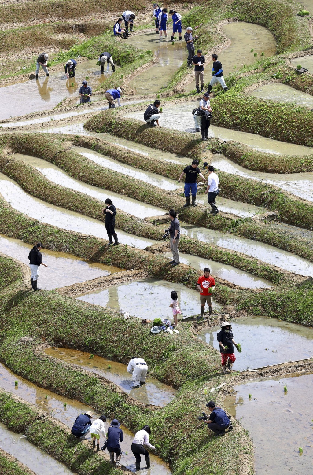 当地时间2025年5月10日,日本石川县轮岛市,志愿者在白米千枚田进行水稻种植。2024年1月1日发生的能登半岛地震和2024年9月21日的强降雨严重破坏该地区。