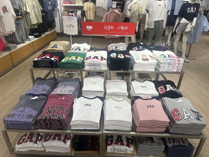 界面时尚在走访GAP南京西路旗舰店时看到,一层男装与女装区域仍以印有品牌Logo的T恤为主力陈列,同时,防晒衣、速干裤等功能性新品也被集中摆放在门店中庭,形成独立货架区。在天猫、抖音等平台的GAP官方旗舰店上,T恤同样是最热销的核心单品。