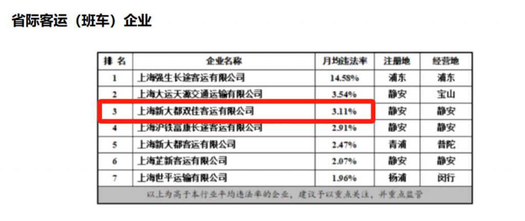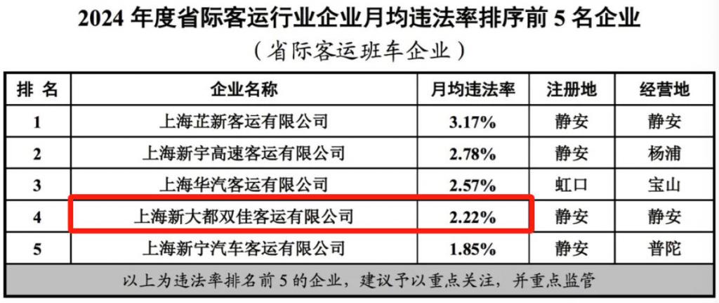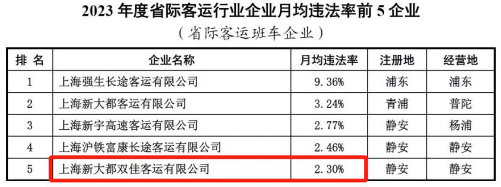 随后记者检索发现,在上海市交通执法总队发布的重点行业企业月均违法率排行榜上,上海新大都双佳客运有限公司曾在 2022 年、2023 年、2024 年连续三年上榜,月违法率分别为 3.11%、2.30% 以及 2.22%。此外,2024 年 02 月 20 日,上海新大都双佳客运有限公司因不按照包车客运标志牌载明的事项运行,被上海市嘉定区交通委员会执法大队罚款 2000 元。上海新大都双佳客运有限公司涉嫌客运班车不按批准的客运站点停靠被苏州市交通运输局罚款 1000 元。