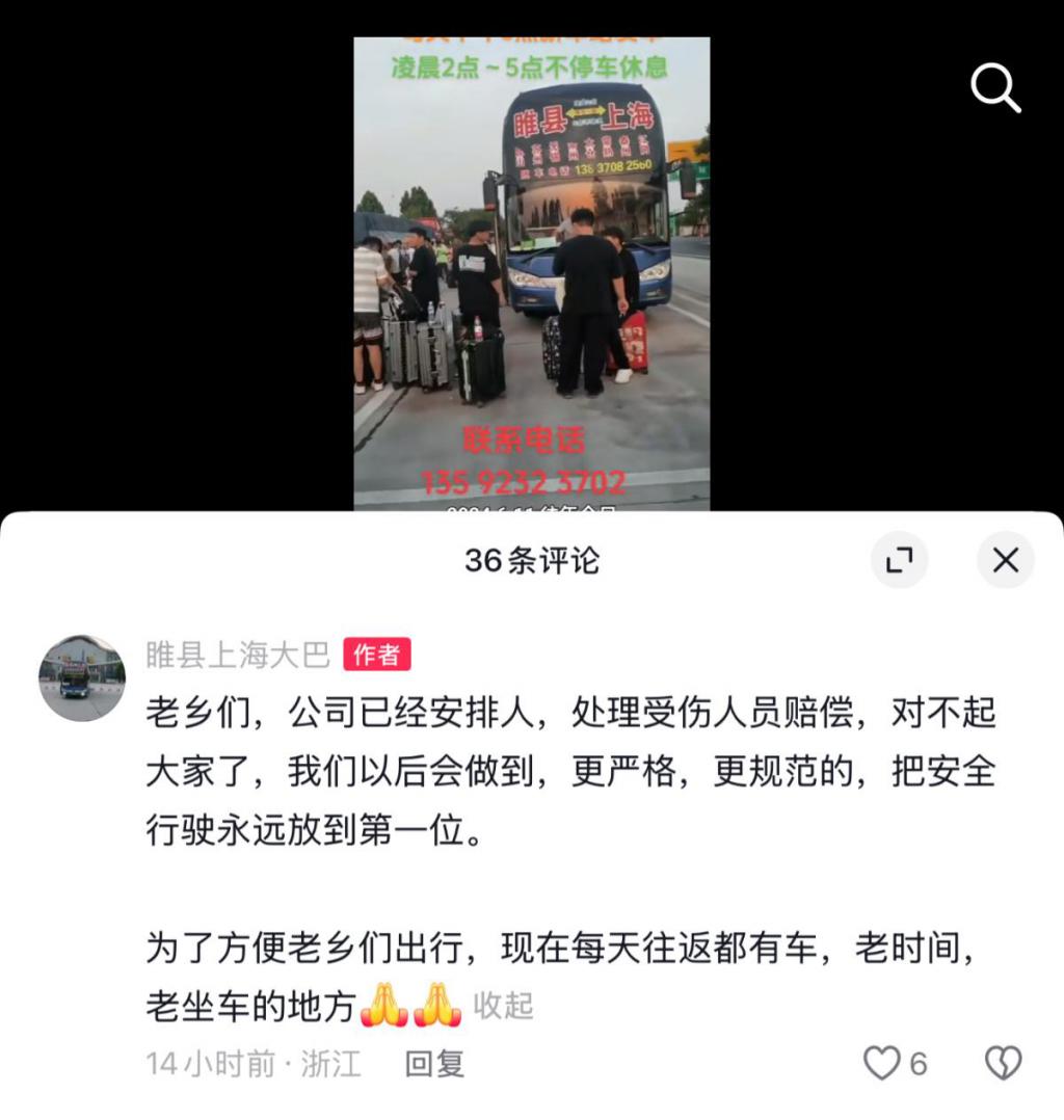 6 月 13 日下午,大河报 · 豫视频记者联系到该辆车的随车电话号码,对方表示:" 目前该条线路已经恢复,每天都有往返车辆,乘车的话需提前打电话。" 此外,记者在社交平台发现该线路大巴车账号,其在评论区回复:" 公司已经安排人处理受伤人员赔偿。"