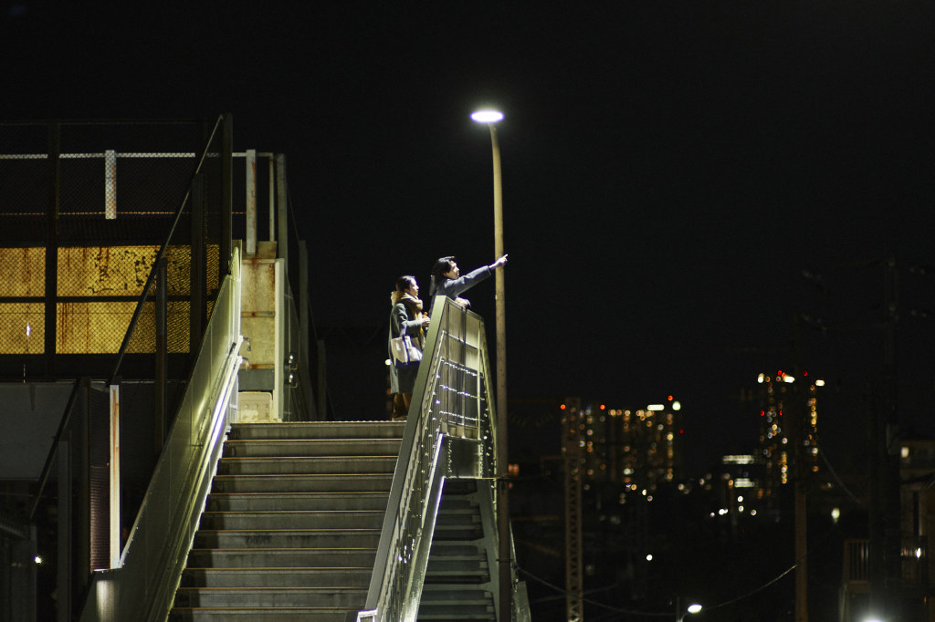 说到日常的风景,他的作品中最常见的场景就是坡道和楼梯,尤其在《惠子,凝视》和《黎明的一切》中,都是作为重要的场景登场。对此,三宅唱解释说:“迄今为止的创作,不妨可以说就是用脚步丈量每一处外景的过程。我总是习惯花费大量的时间漫步街头,那些偶然遇见的阶梯与坡道,往往因其独特的叙事潜力被纳入镜头。我想,未来或许仍会被特定城市的这种空间特质所吸引,但也可能完全转向其他维度的空间探索。”