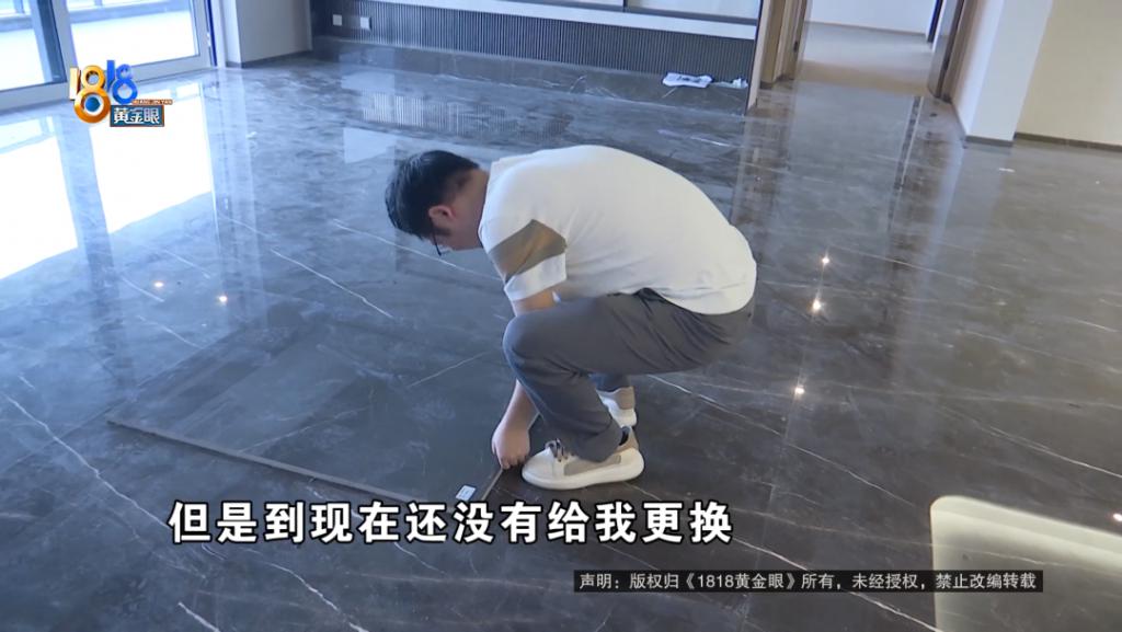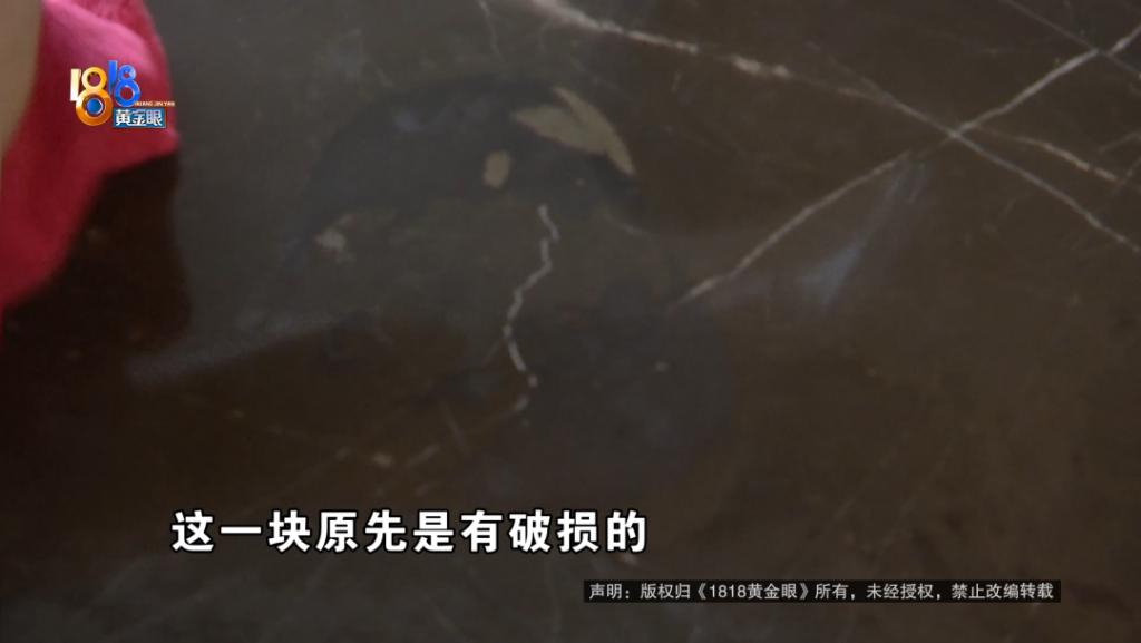 方先生:这一块原先是有破损的,开发商叫维修工人来维修封了一层釉,封完釉之后就有两个黑影、黑斑。从 4 月 23 号收房到现在,已经快两个月了,开发商(新)石材已经拉来了,但是到现在还没有给我更换。