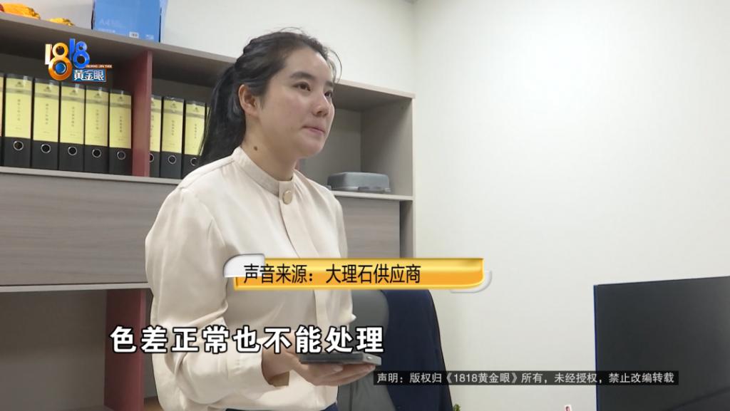 大理石供应商:色差正常也不能处理,因为是这个东西都是天然的,那天然石材它本身批次里面本身也有变化的,那色差肯定会有一点的。有一种办法是可以处理的,正常就是着色,但是肯定跟实际跟那个,跟原版可能会稍微有一点差别,然后这个东西基本上说保持个 5 到 8 年也没啥问题的。