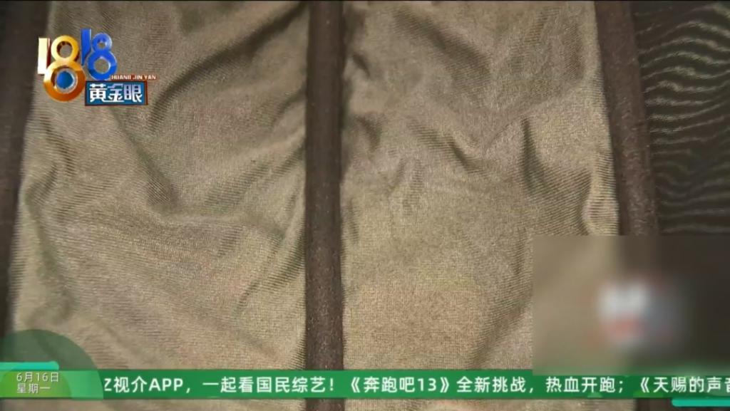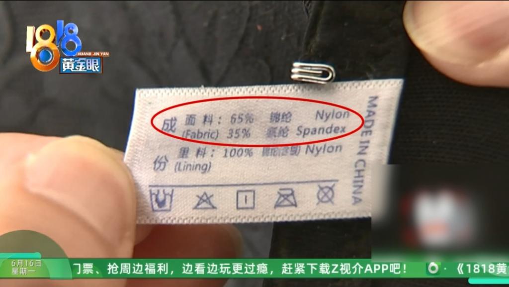 采访时马女士带来了那件衣服,标签上写着 " 傲雪棋 ",面料为 65% 锦纶 35% 氨纶,里料为 100% 锦纶,括号 " 含银 "。