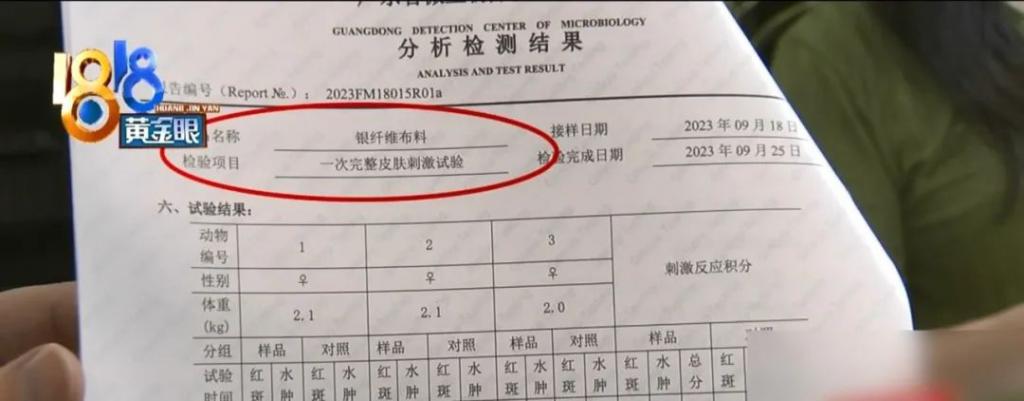 回到现场为了证明材质是有效的,门店负责人拿出了一份分析检测报告,记者发现这不是一份针对材料成分的检测报告上面写着样品名称是银纤维布料,检验项目为一次完整皮肤刺激试验,结论显示为无刺激性。
