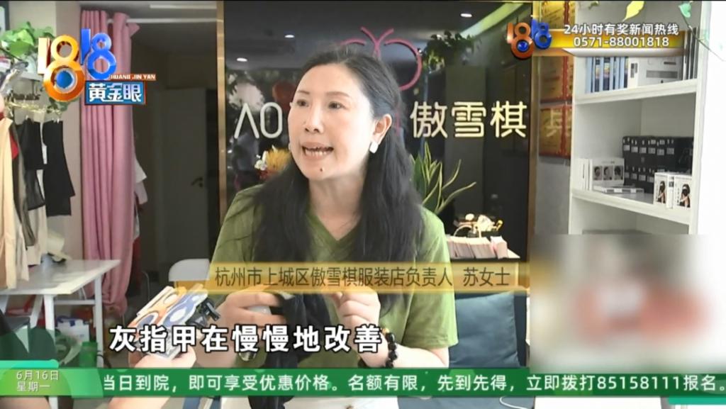 杭州市上城区傲雪棋服装店负责人 苏女士:如果你有灰指甲,你就是坚持穿,白天也穿,晚上也穿,那么你穿个一个月,你就能看到明显的效果,灰指甲在慢慢地改善。那么你再坚持穿,它灰指甲,长期穿它就会好。