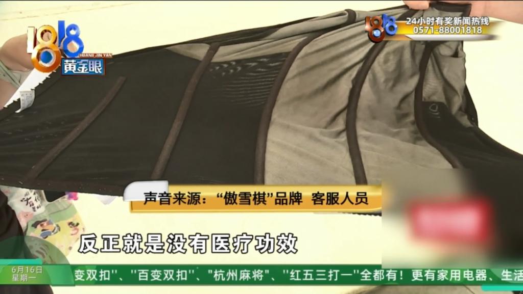 杭州市上城区傲雪棋服装店负责人 苏女士:我们从来没说有医疗效果,就是可以慢慢地变好。她女儿(说)没效果,她不是实际(穿着)人,因为她女儿没穿。这个都已经穿了这么久了,你如果要退,你可以早一点。当时的话是说,我愿意退她 500 块钱,这个衣服还是给她妈妈拿去穿,但是她不肯呀。