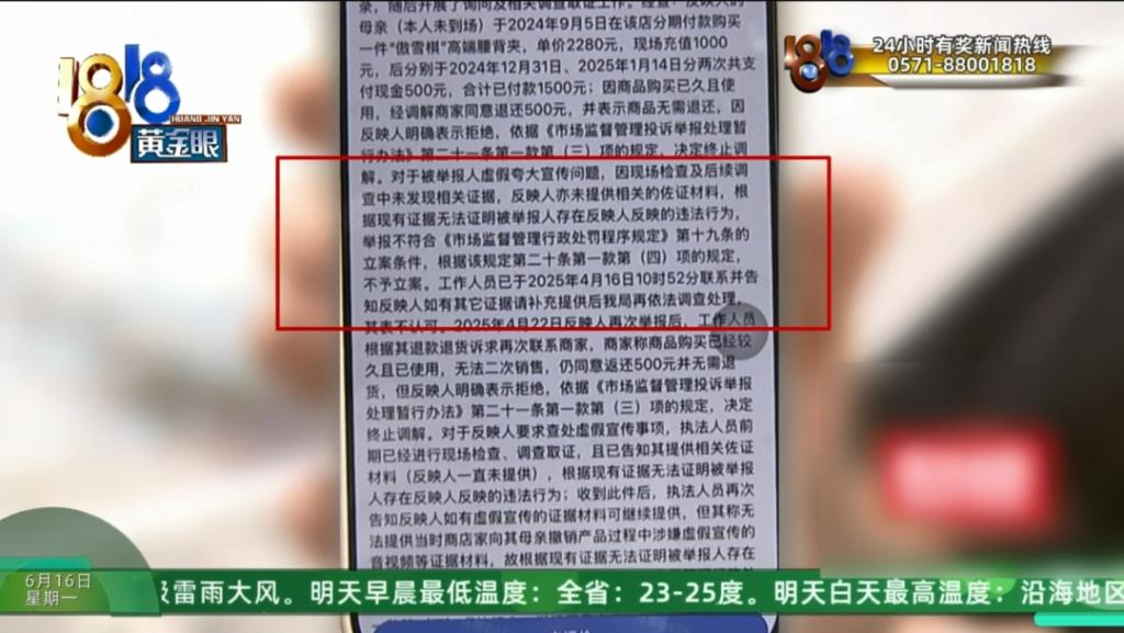 客服的说法跟店家的说法明显是不一样的,马女士之前已经把情况反映给属地市场监管部门,对方之前回复关于被举报人虚假宣传夸大问题,现场检查及后续调查中未发现相关证据,反映人亦未提供相关的佐证材料,根据现有证据无法证明不予立案并表示反映人如有其它证据补充后,再依法调查处理。