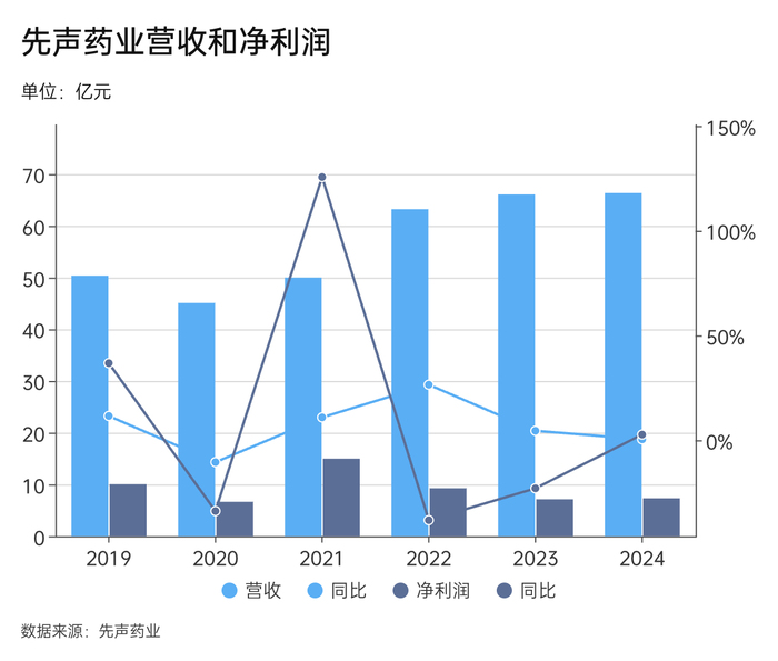 界面新闻记者根据年报统计发现,自2022年起,先声药业营收和净利润增长遇到瓶颈。其中,2019年至2024年,先声药业业绩如下图所示。