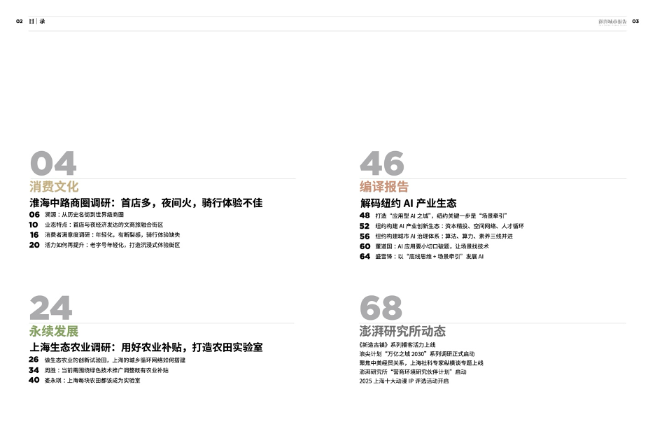 《澎湃城市报告》总第24期《上海商圈消费者满意度调研①淮海中路商圈》已于5月25日发布,本报告包含《淮海中路商圈调研:首店多,夜间火,骑行体验不佳》、《上海生态农业调研:用好农业补贴,打造农田实验室》和《解码纽约AI产业生态》3份子报告。
