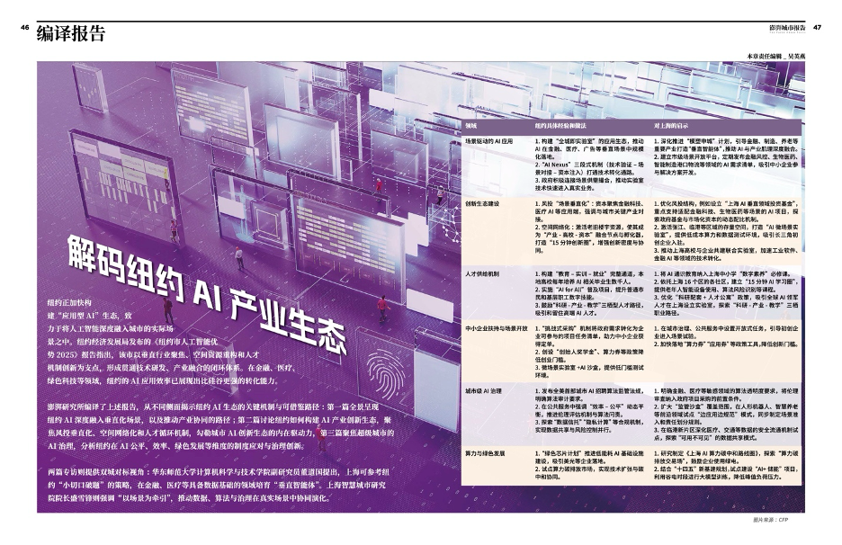 澎湃研究所编译了上述报告,从不同侧面揭示纽约AI生态的关键机制与可借鉴路径。两篇专访则提供双城对标视角:华东师范大学计算机科学与技术学院副研究员董道国提出,上海可参考纽约“小切口破题”的策略,在金融、医疗等具备数据基础的领域培育“垂直智能体”。上海智慧城市研究院院长盛雪锋则强调“以场景为牵引”,推动数据、算法与治理在真实场景中协同演化。
