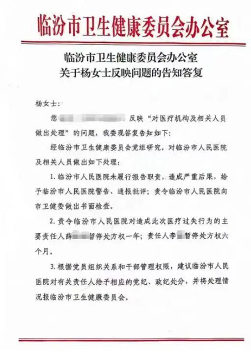 2024 年 10 月 16 日,临汾市卫生健康委员会办公室书面回复杨美称,经研究,对临汾市人民医院及相关人员均作出相关处理。其中,医院未履行报告职责,造成严重后果,给予警告、通报批评,并责令其向市卫生健康委作出书面检查。