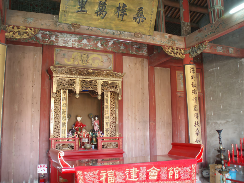 会所的旧迹后来逐渐湮灭,福建会馆仍有部分留存,2007年初春我曾去踏访,位于馆内町一丁目,建在一处小小的台地上,沿石阶往上走,仰首可见一门楼,宋代风格,端庄秀丽,有“福建会馆”的匾额,入门有一前院,正面是正堂,堂前的匾上书写三个字“星聚堂”,堂内金色底面的匾上写有“桑梓万里”四个字。据说会馆的正殿已在原爆中毁坏,现在的门楼和正堂的柱子,看上去也是新构。正堂的右面,竖有一尊小小的(其实是等身大)孙中山的一手插裤袋、一手拄手杖的铜像,这自然是后来塑造的。未见其他的房屋,大概都在后来圮坏了。