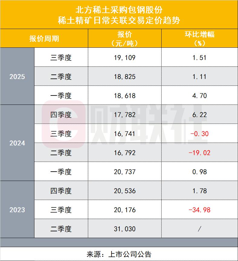 从 2024 年四季度起,稀土精矿日常关联交易价格开始止跌企稳,已呈现了连续四个季度环比上涨。图源 / 财联社