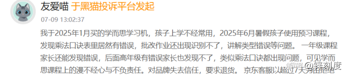 在黑猫投诉平台上,有关“AI学习机一点也不智能”的投诉颇多。大多数问题集中在“虚假宣传”,比如没有AI一对一功能、AI作业诊断功能不好用、数学题讲解不对等。其中有消费者提到,购买了学而思学习机s3,试用后出现频繁卡顿、知识内容有误、拍的题和讲解的题不一致等问题。另有消费者投诉称:我于2025年1月买的学而思学习机,孩子上学不经常用,2025年6月暑假孩子使用预习课程,发现乘法口诀表里居然有错误,批改作业还出现识别不了、讲解类型错误等问题。