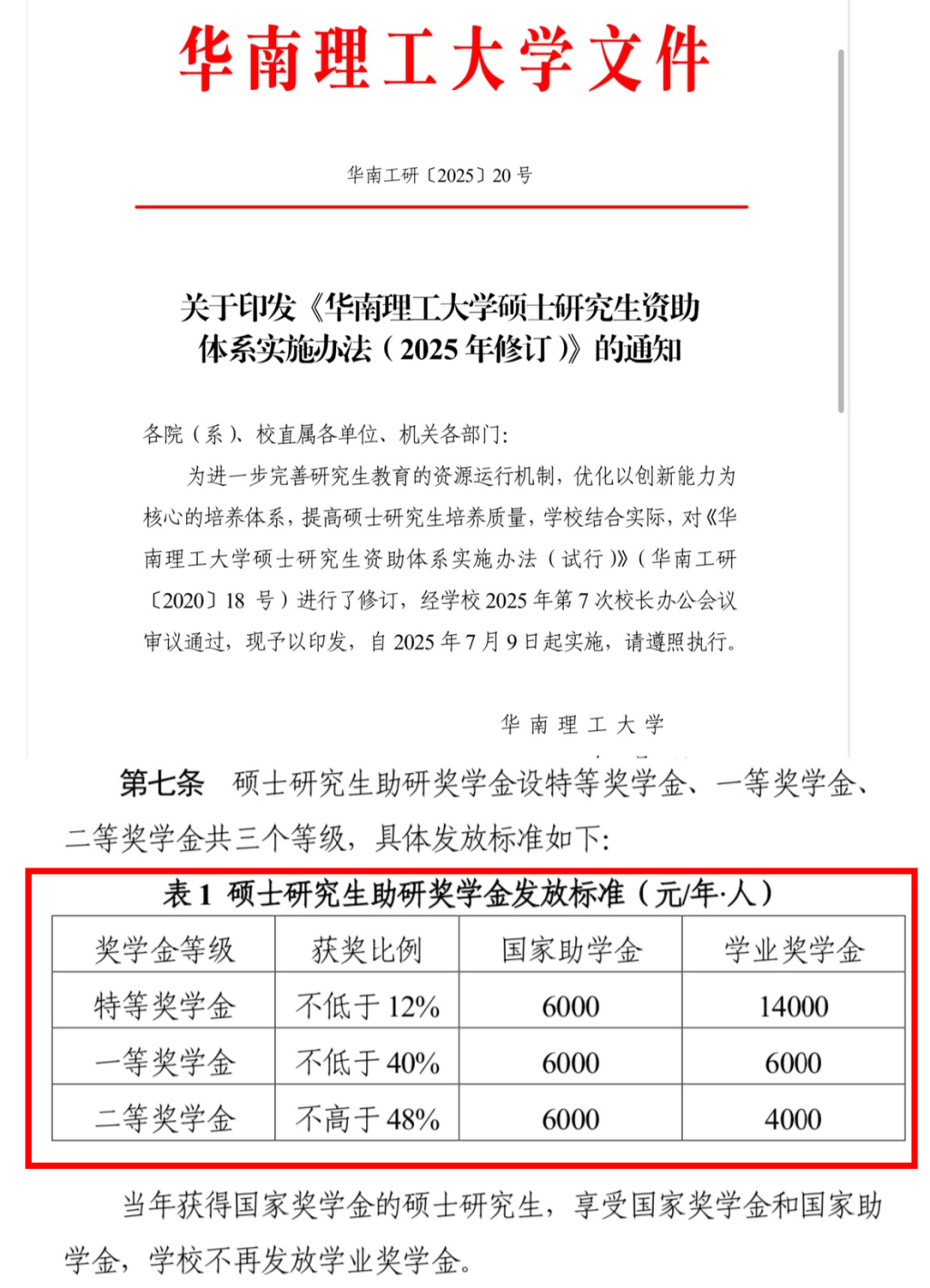 近日,华南理工大学在内网发布《华南理工大学硕士研究生资助体系实施办法(2025 年修订)》(下称《办法》)称,整合国家助学金、学业奖学金,设置硕士研究生助研奖学金,按照三级标准发放。办法适用于2025级及以后入学的硕士研究生。