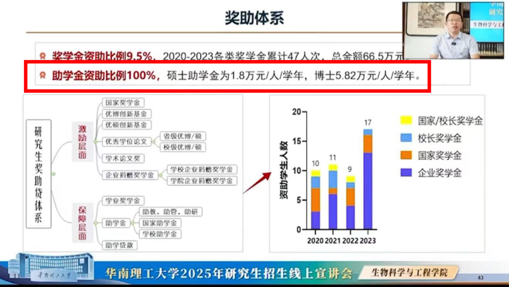 华南理工大学2025年研究生招生线上宣讲会(生物科学与工程学院专场),招生老师称该校助学金资助比例100%,硕士助学金为每学年1.8万元。华南理工大学研招办视频号直播回放截图