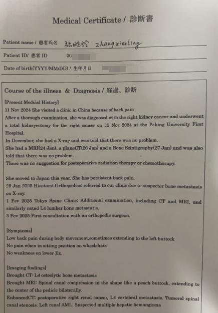 2025 年 2 月,张晓玲又到国外的医院进行了检查,被确诊为 " 肾癌骨转移 "。张晓玲称,她此后咨询过多位专家级的医生,都告知她,她所患的肾癌和骨转移都不是一朝一夕能形成的,如果能早发现早治疗,病情肯定不会如此严重。