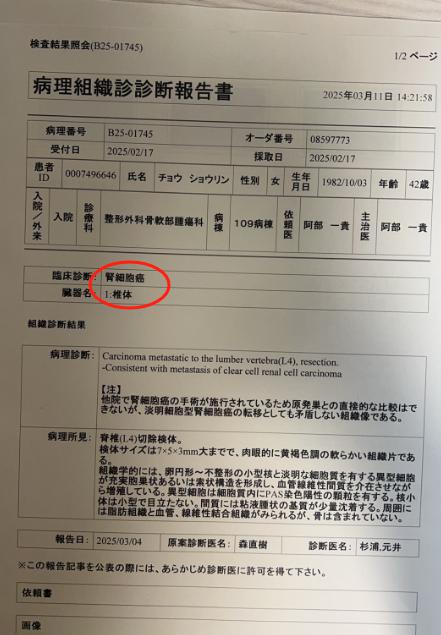 △ 2025 年 2 月,张晓玲在国外检查,被确诊为 " 肾癌骨转移。