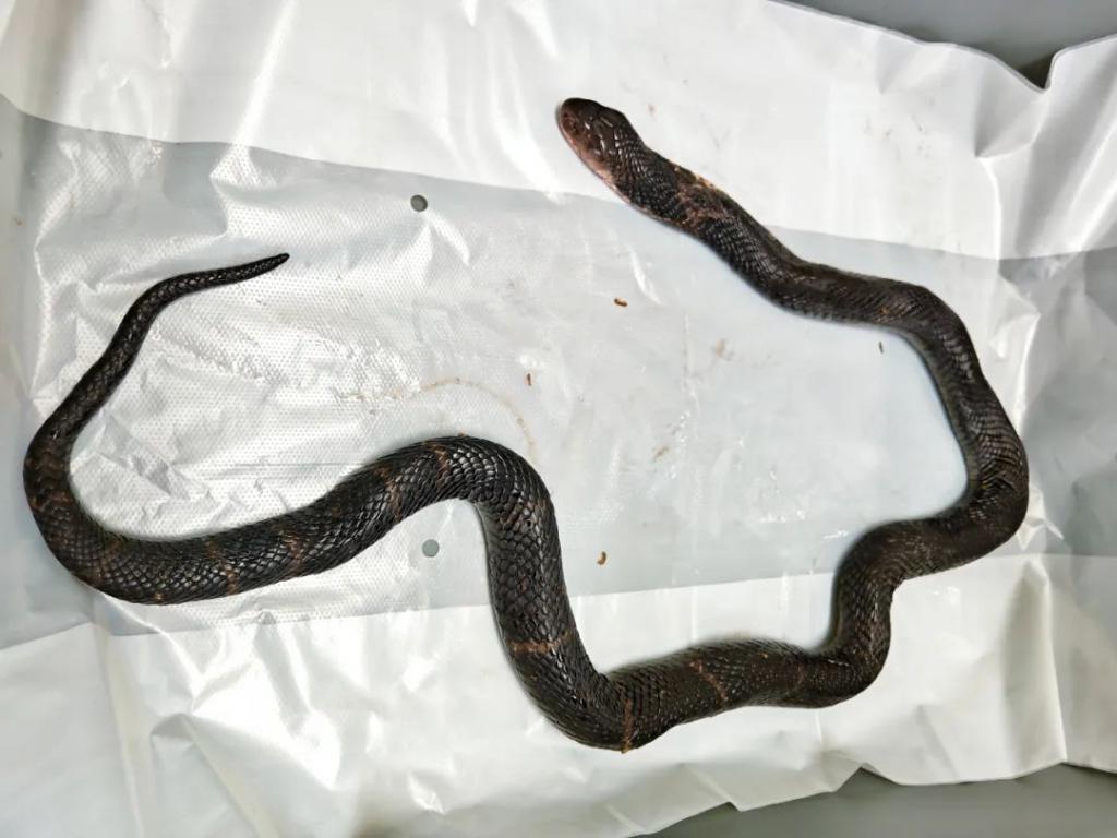 当日,海关关员在对进境旅客的行李物品进行监管时,发现 1 名旅客手提的红色塑料袋机检图像异常,图像显示袋内装有疑似蛇形态的物体,随即对其进行拦截检查。经检查,海关关员在红色塑料袋内发现 1 条用白色透明塑料袋装着的蛇,发现时已无生命体征。该蛇体背呈深褐色,颈部扁平宽大,颈背部有白色斑纹。后经专业机构鉴定,该蛇为濒危动物舟山眼镜蛇。舟山眼镜蛇属于《濒危野生动植物种国际贸易公约》(CITES)附录Ⅱ所列明的保护物种。