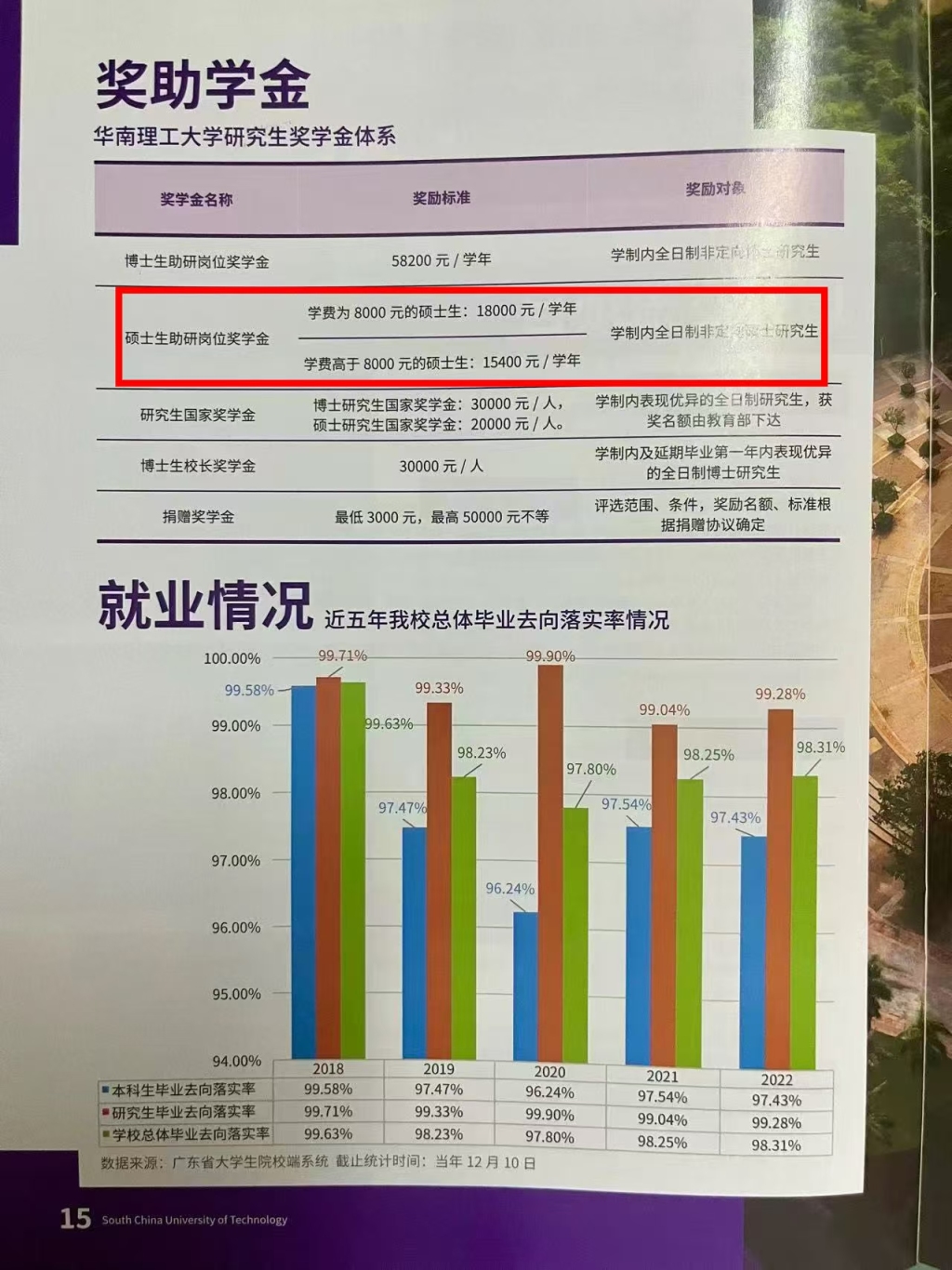 华南理工大学研究生招生资讯册内页,“奖助学金” 板块明确硕士生助研岗位奖学金按学费分为1.8万和1.54万元。