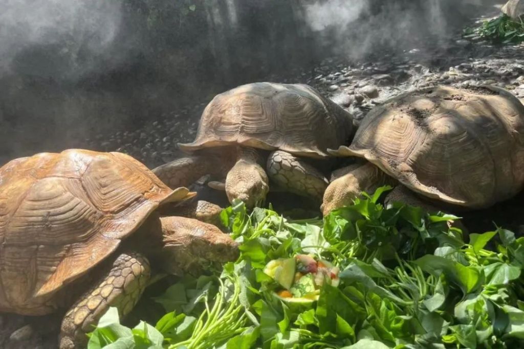 龟算是喜欢追逐阳光跑的动物了,面对高温比较活跃,胃口也相对好了很多。陆龟尤其如此,要多晒晒太阳,太阳可以帮助它们提高温度,加速新陈代谢,有助于它们合成维生素D,从而让它们更好地吸收钙质。充足的光照可以杀灭一些病菌,起到预防疾病的作用。另外,对于一些龟来说,晒太阳可以加速色素的沉淀,帮助它发色。虽然两栖爬行动物喜欢阳光,但暴晒也是不行的,体温过高也会中暑脱水,严重时甚至会威胁生命,相应的防暑降温措施必不可少。大型陆龟像苏卡达象龟、亚达伯拉象龟,室外展区也安装有喷雾系统。