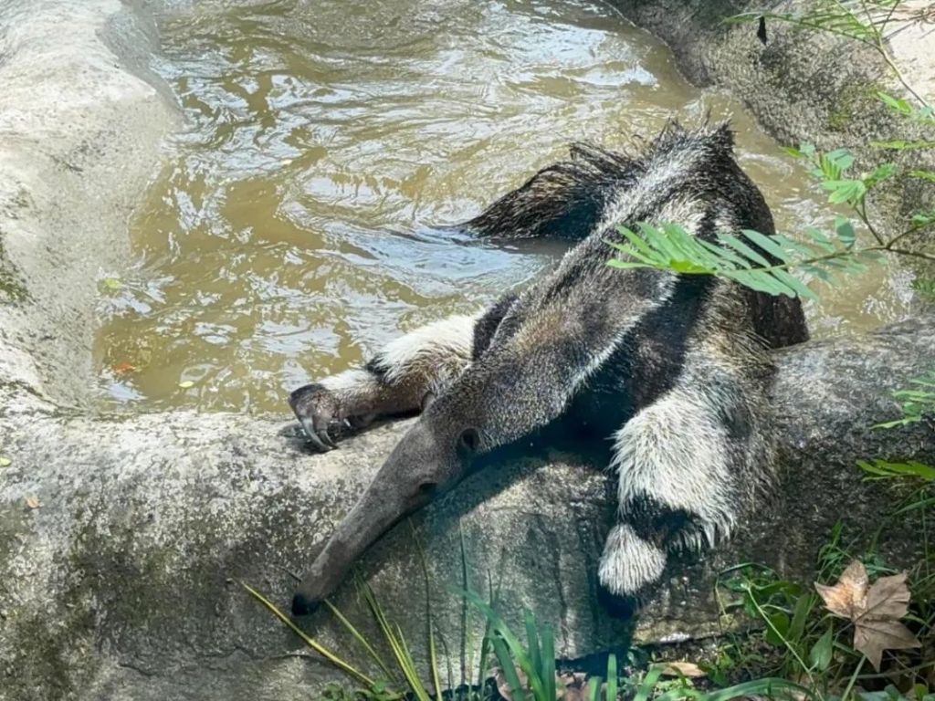 大食蚁兽对水特别偏爱,夏季,展区内的水池成了泡汤玩水的“避暑胜地”。进入水池后,大食蚁兽便开启了第一步全身清洁的工程。通过对毛发皮肤反复地搓洗,大食蚁兽能够有效去除身上的污垢与寄生虫,保持皮肤的健康与清洁。大食蚁兽会躺倒在湿润的泥土上欢快地翻滚,这层泥土其实是大食蚁兽的皮肤保护膜,能起到保持皮肤湿润、防止蚊虫叮咬的作用。