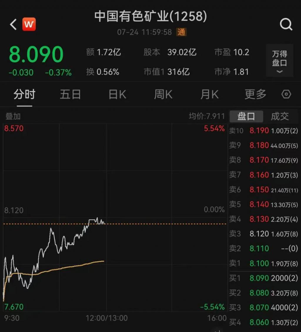 二级市场上,中国有色矿业 7 月 24 日开盘一度大跌超 5.5%,截至午间收盘,跌幅缩小至 0.37%,报 8.09 港元,公司总市值 316 亿港元。