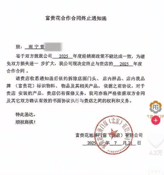 记者注意到,21 日下午," 富贵花门窗总部 " 在网络上发布与曾某的合作终止通知函,同时郑重声明,经核实,视频中男子为富贵花门窗南宁经销商曾某。部分不明情况的网友,将公司总部运营员工思思(小羊)误认为事件的相关方,对此公司以品牌担保郑重澄清,思思(小羊)长期驻佛山总部,负责短视频运营工作,与南宁经销商曾某不存在网络传言中的不正当关系。公司已通过法律途径,固定证据,并将保留追究传播不实信息法律责任的权利