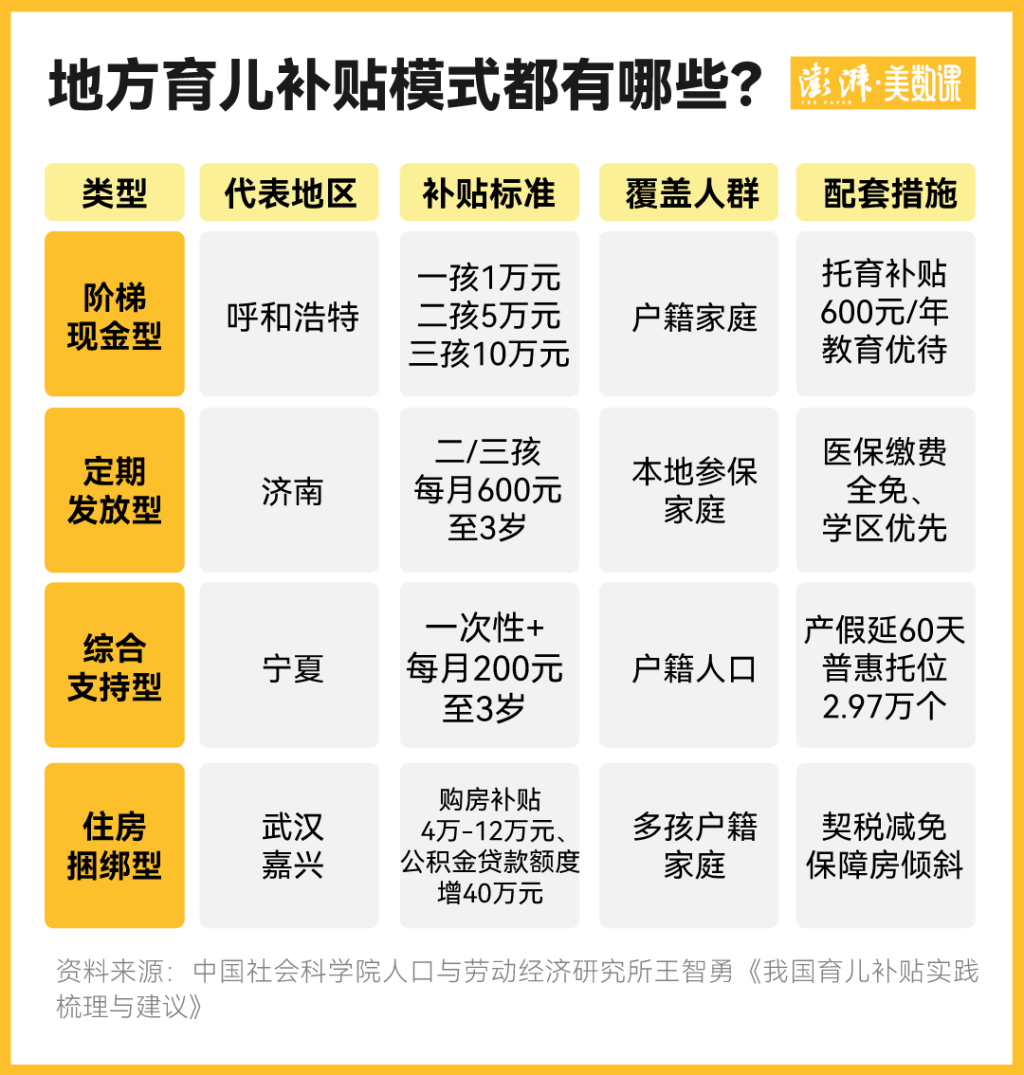 根据中国社会科学院人口与劳动经济研究所王智勇的梳理,从2021年四川攀枝花在国内首创育儿补贴机制以来,地方育儿补贴的模式主要分为一次性发放现金和定期发放补贴两种,此外也有一次性发放和定期发放相结合的综合支持型。