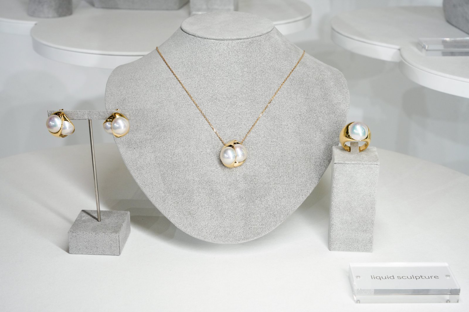 Tasaki的liquid sculpture系列也在此次展览中亮相。该系列用珍稀马贝珍珠来展现水珠滴落的定格瞬间,马贝珍珠的莹润虹光与黄金的光测交织,呈现一种动态美感。