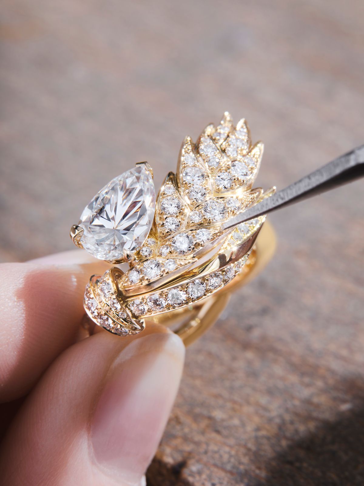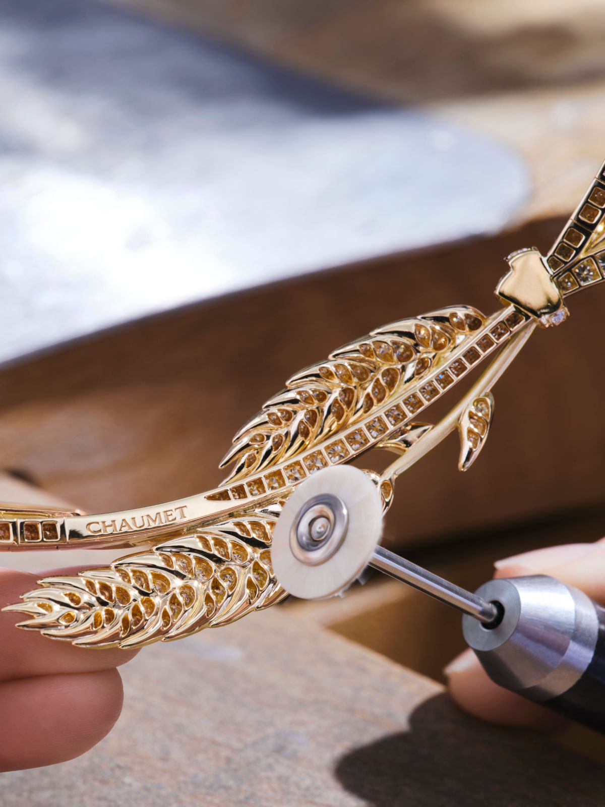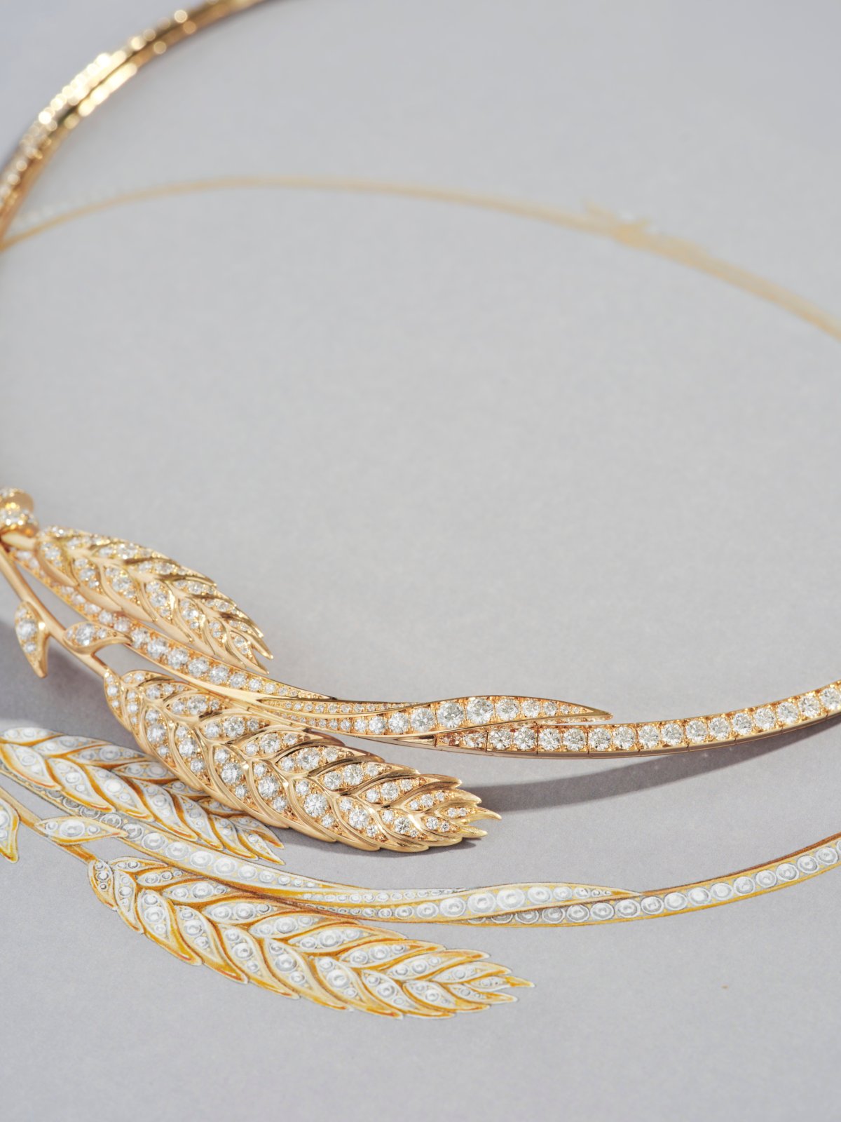 该系列以尚美自1780年以来标志性的麦穗元素为灵感,珠宝大师以缎面黄金来演绎金色麦田的意象,手工勾勒蕾丝纹理,用钻石密镶来勾勒麦穗随风起伏的生动轮廓。