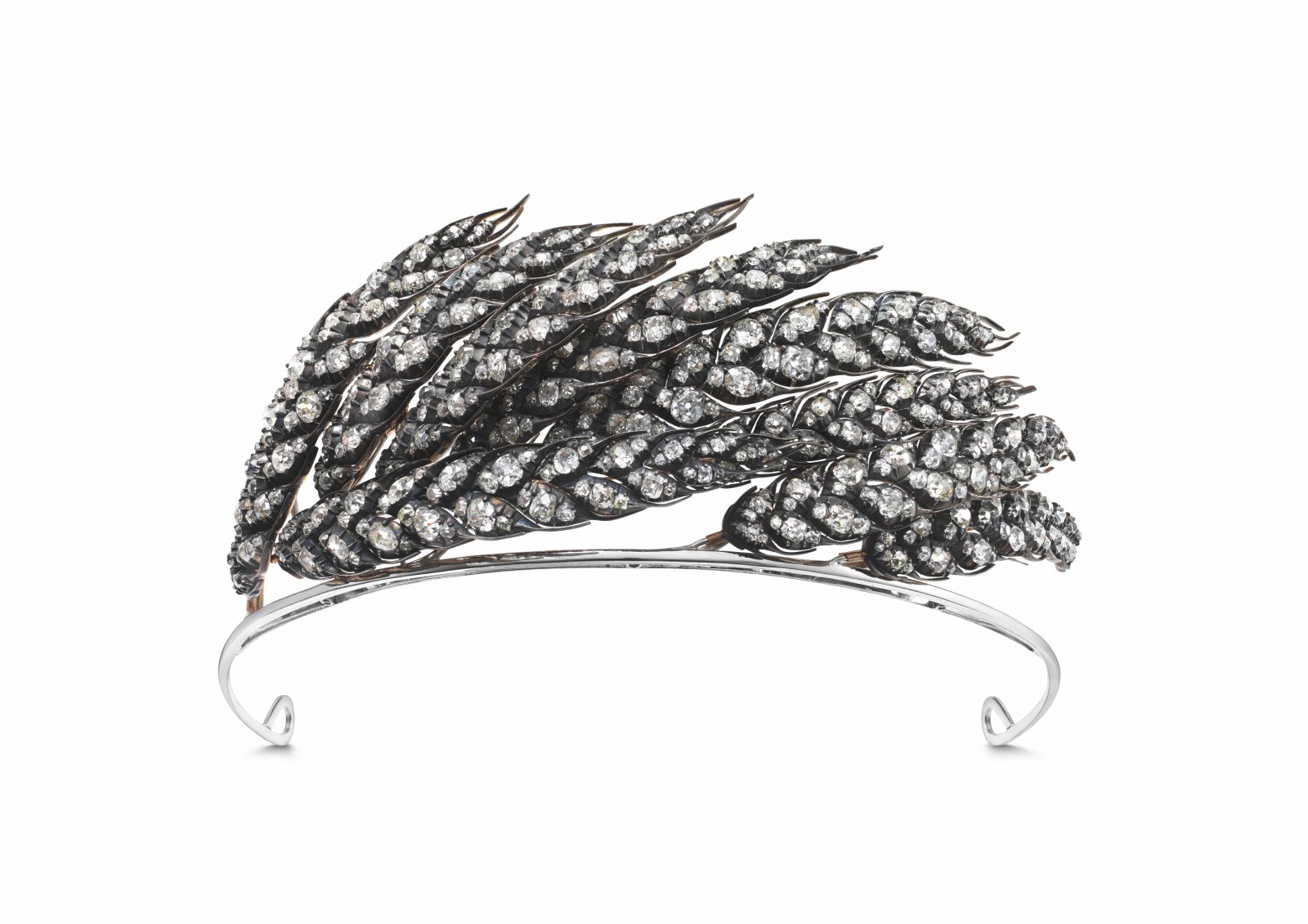 CHAUMET尚美巴黎发布全新L’Épi de Blé麦穗系列高级定制珠宝套系,包含四件艺术作品,分别为一顶现代风格的金穗冠冕,一条由精致麦穗联结而成的项链,一枚主石为2克拉水滴形钻石的戒指,以及一对各镶嵌1克拉水滴形切割钻石的耳环。