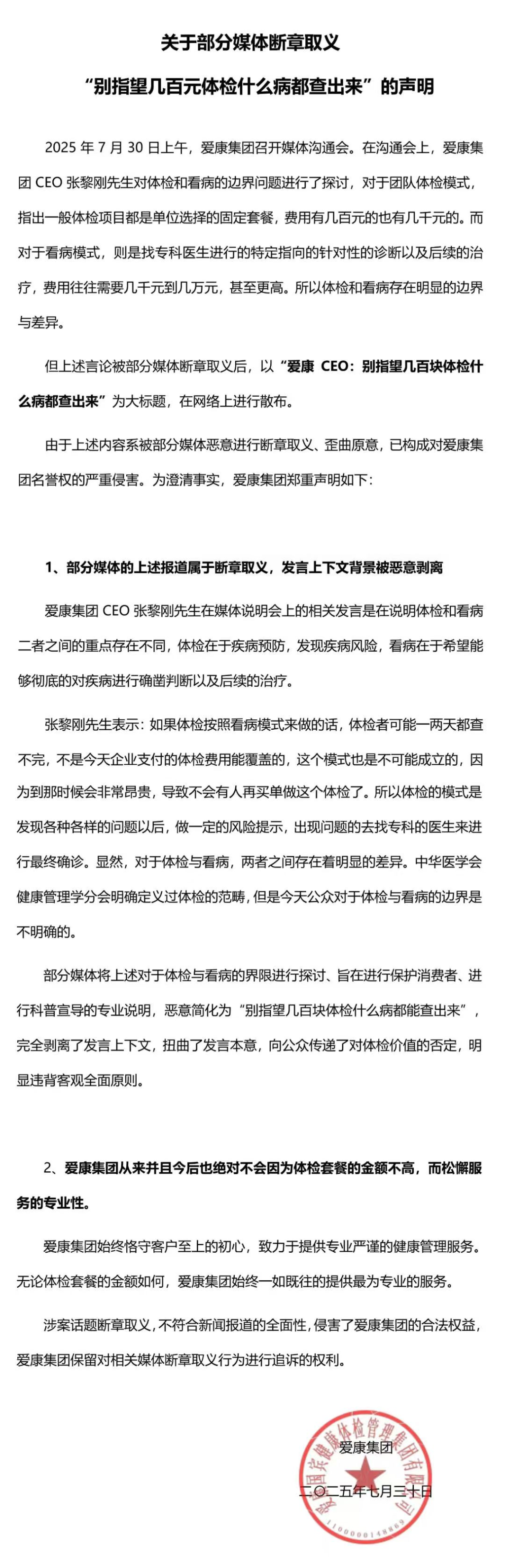 7月30日晚间18时32分,“爱康国宾”微信公众号发表了一则《关于部分媒体断章取义“别指望几百元体检什么病都查出来”的声明》。