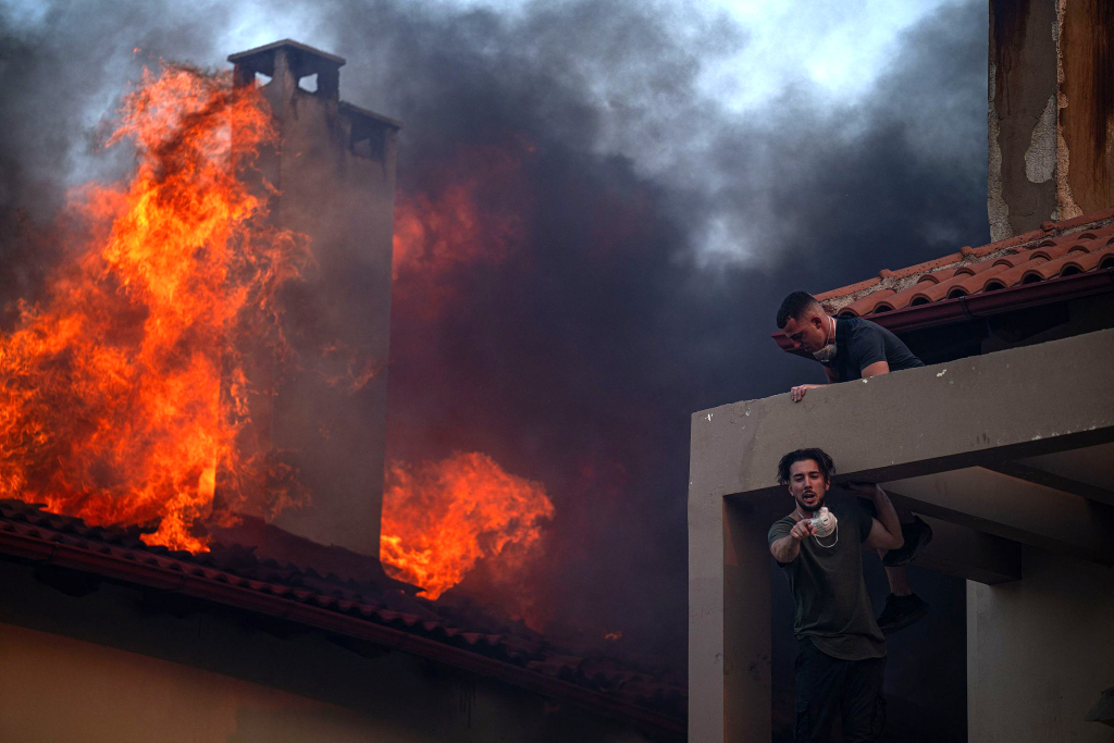 7月26日,希腊雅典附近的克里奥内里,当地居民撤离一栋正在燃烧的房屋。
