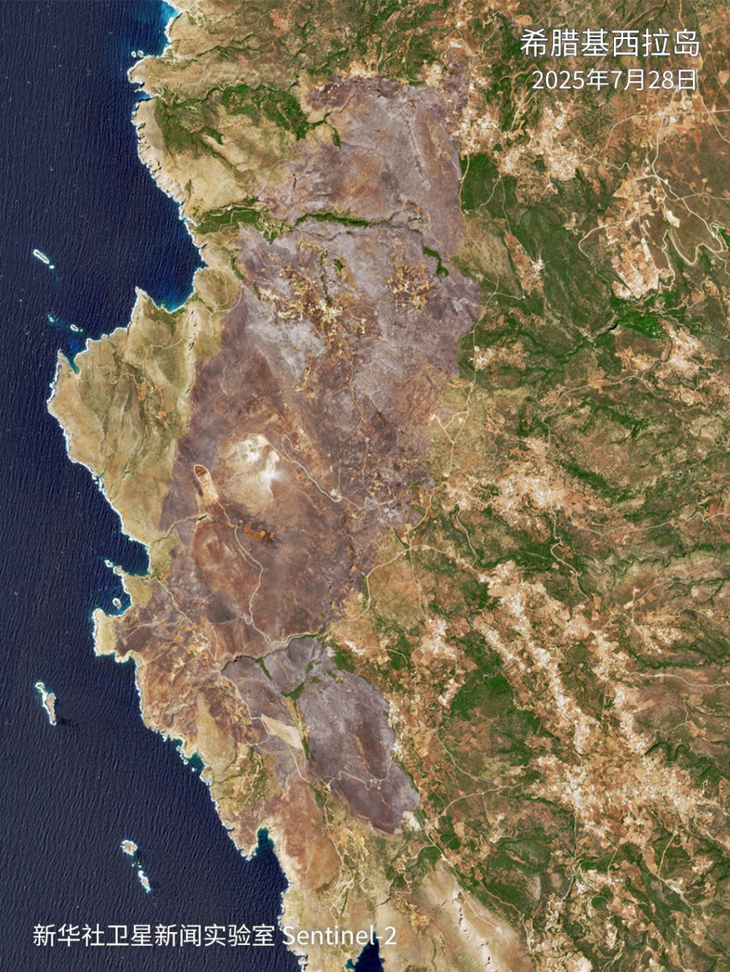 这张拍摄于7月28日的卫星图像显示,希腊基西拉岛西部一场野火留下的大面积棕黑色过火区域。媒体融合生产技术与系统国家重点实验室供图