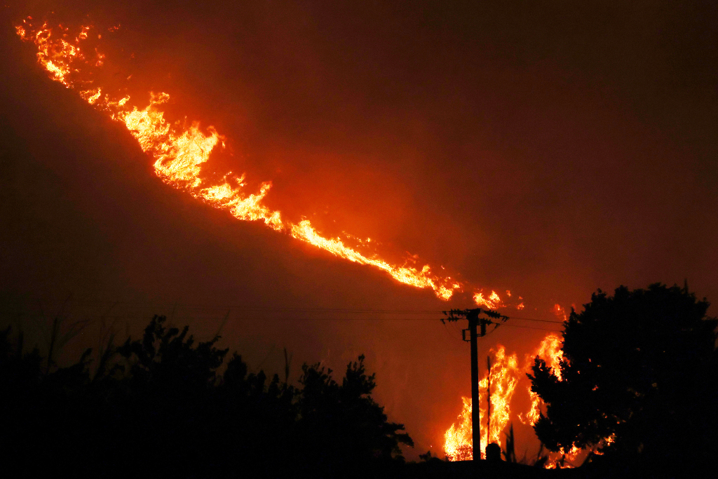 7月26日,希腊雅典西北部郊区克里奥内里,野火燃烧树木。