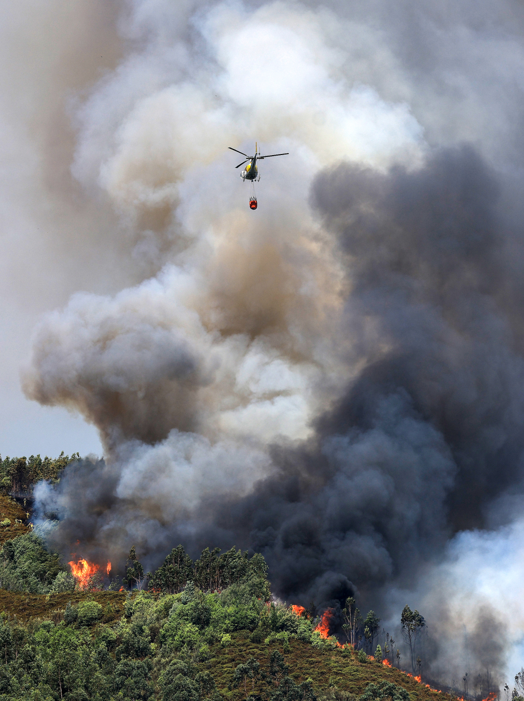 7月30日,葡萄牙阿罗卡圣欧拉利亚,一架消防直升机在森林火灾现场上空飞行。