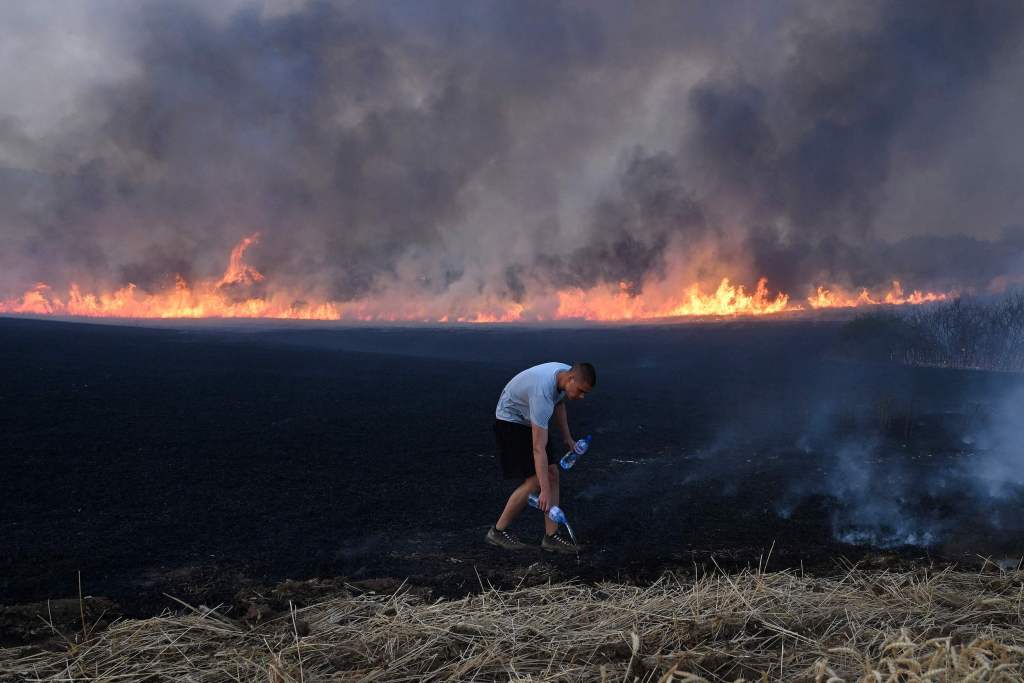 7月21日,保加利亚索非亚,在波诺尔村附近,一名志愿者用矿泉水瓶灭火,背后是逐渐逼近的烈火。