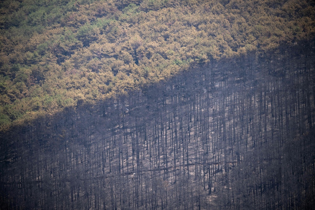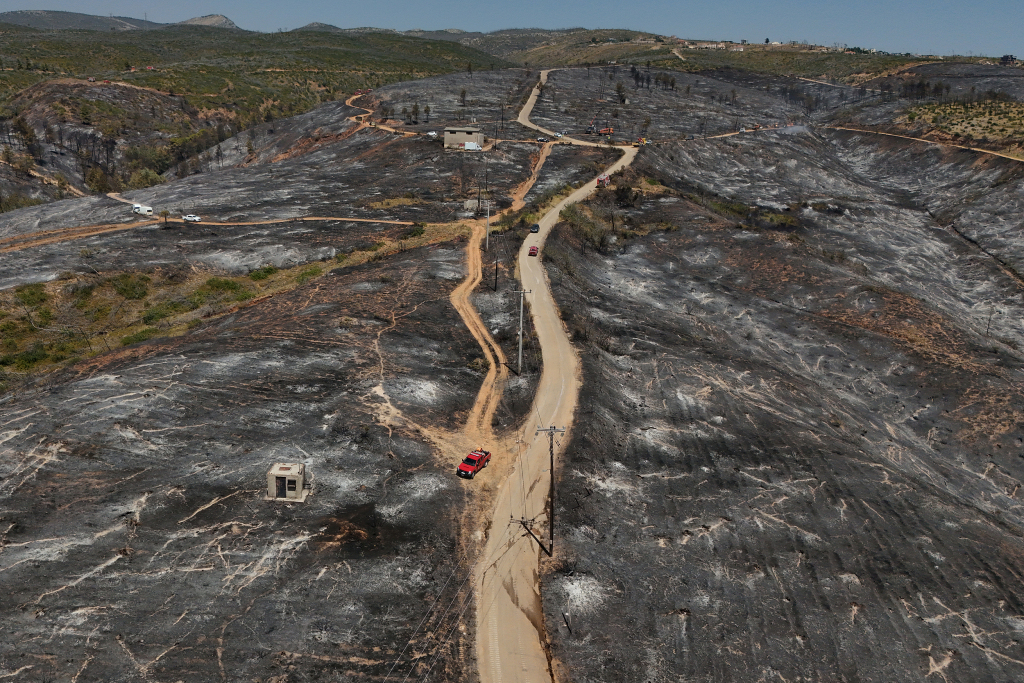 7月27日,希腊雅典附近的克里奥内里,航拍野火烧毁和破坏的森林区域。