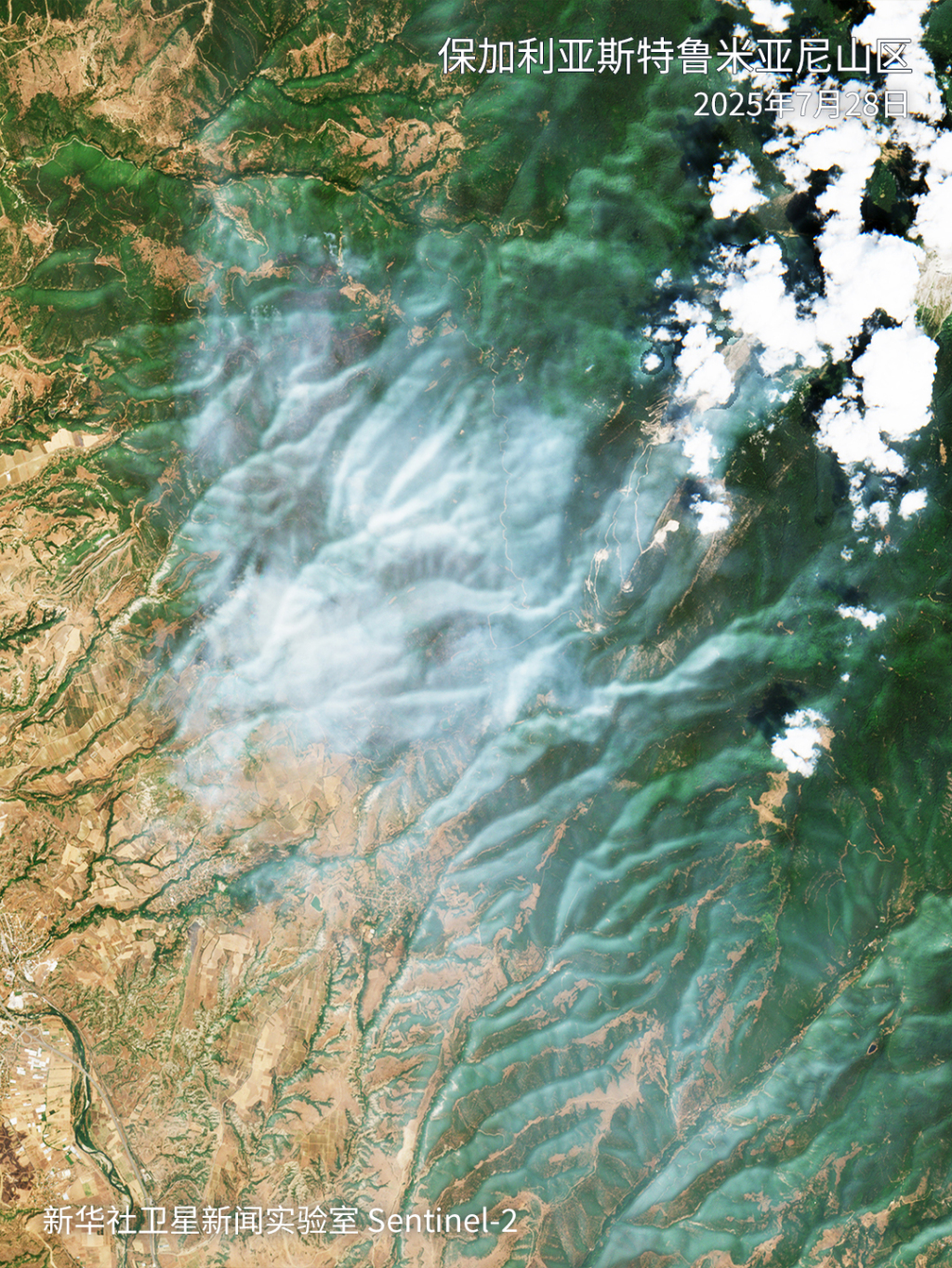 这张拍摄于7月28日的卫星图像显示,保加利亚西南部斯特鲁米亚尼山区火势严峻、烟雾持续扩散。媒体融合生产技术与系统国家重点实验室供图