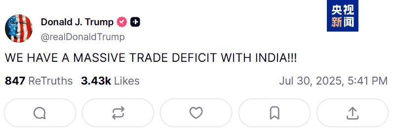 美国总统特朗普当地时间 7 月 30 日通过社交媒体宣布,将从 8 月 1 日起对印度输美商品征收 25% 的关税并实施其他 " 惩罚 "。特朗普用大写的英语发文称:" 我们与印度有着巨额的贸易逆差!!!" 这对于自认是美国 " 朋友 " 的印度来说,多少有点 " 情何以堪 " 的意味。