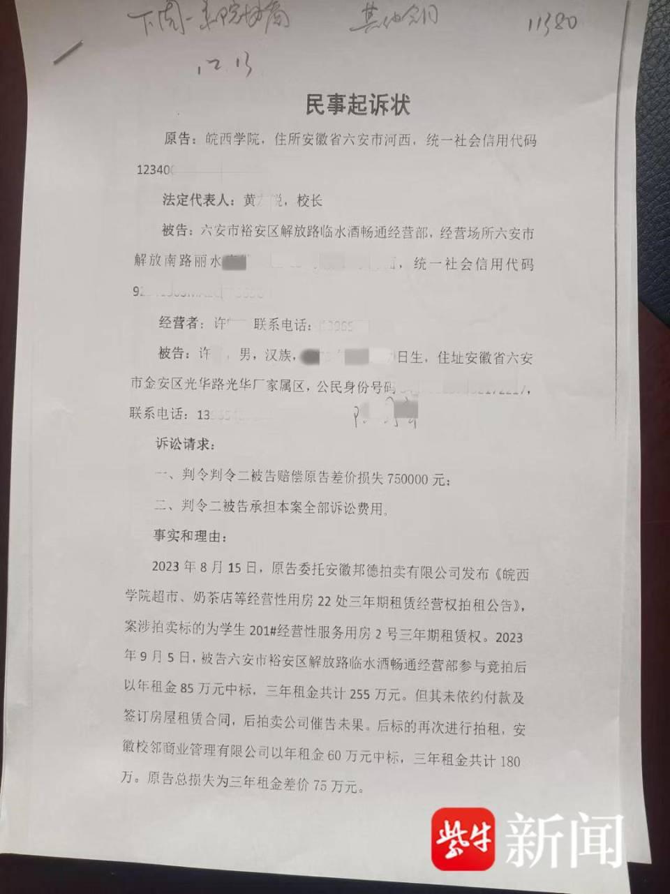 不久后,许先生被皖西学院告上法庭。扬子晚报紫牛新闻记者从一份《民事起诉状》看到,该院以许先生的经营部参与竞拍中标该校商铺,未依约付款及签订房屋租赁合同,造成损失三年租金差价 75 万元,要求其承担赔偿责任。