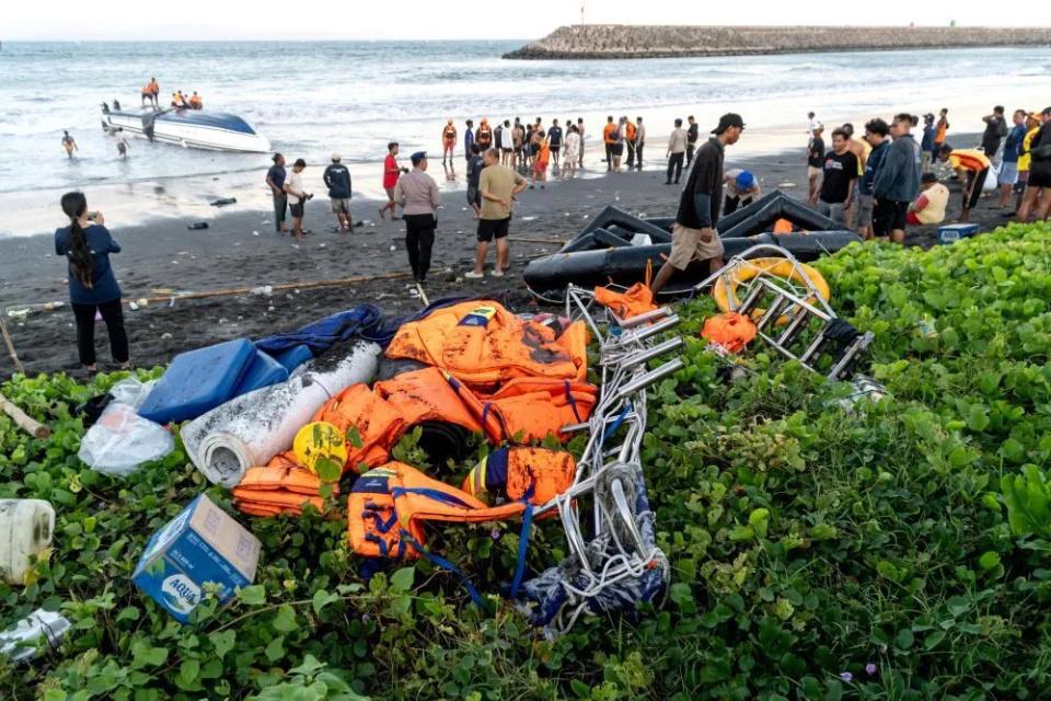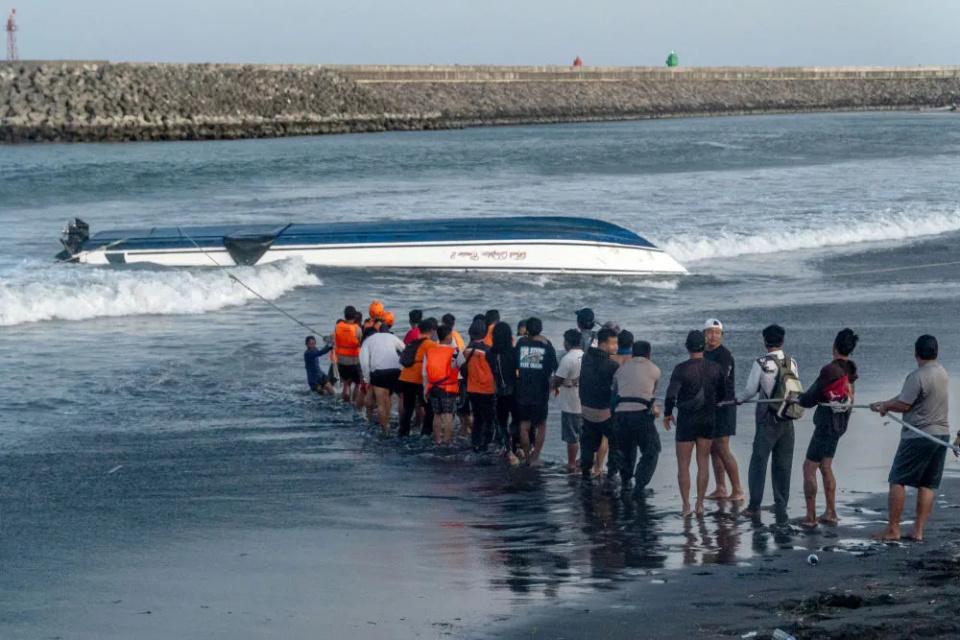 △ 8 月 5 日,在印度尼西亚巴厘岛,工作人员将倾覆快艇拉到岸边。
